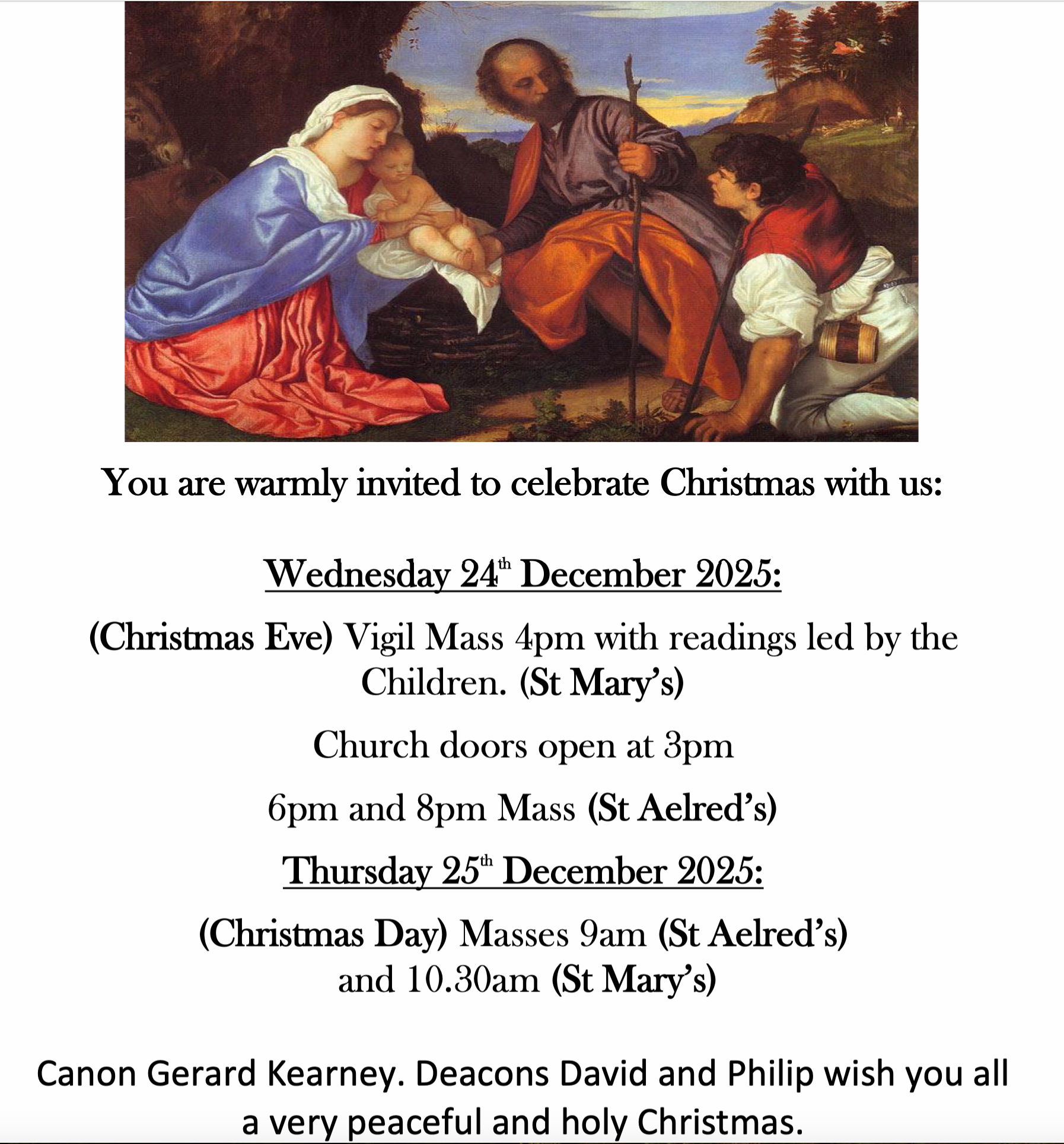 If your children are coming to the 4pm Christmas Eve Mass and would like to be involved (e.g. by doing a reading/bidding prayer/offertory) please email Charlotte Burrell for further information at: catechist.stmary.knaresborough@dioceseofleeds.org.uk Children are encouraged to come dressed as their favourite Nativity character and will be invited up to sing Away in a Manger after the homily. St Aelred’s 9am Mass will have a live Nativity please come as your favourite Nativity character. Contact Krista for further details office.staelred@dioceseofleeds.org.uk