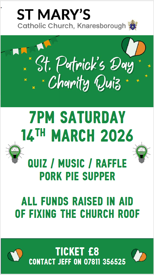 St Patrick’s Day Quiz Saturday 14th March 2026, 7.00pm (Church Hall) Tickets £8 per person. Quiz / Music / Raffle / Supper.